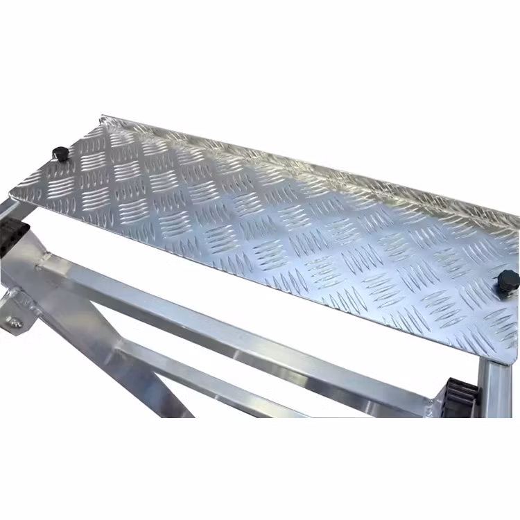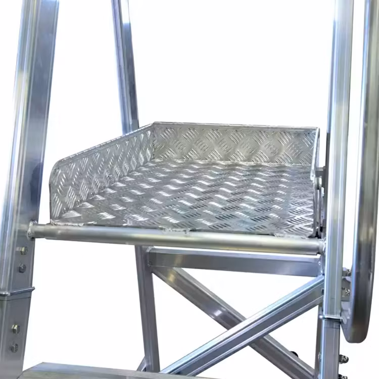 Plattformen har allt du behöver för att stå och arbeta stabilt. Både trappsteg och arbetsplattform är gjorda i halksäker durkplåt i aluminium försedda med rillor. Trappstegen är sammanfogade i vagnstycket med hjälp av kragning, en mycket stark teknik som ger en stabil, lätt och hållbar konstruktion.